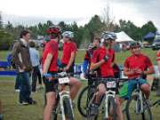 10時からのブリーフィング。 まぁ、リラックスした感じです。 仮装した人がそこら、ここらに。 チーム・ピンクレディ。(写真左)左の女の子に平地で抜かれました。。。 セミ・フォーマルなライダーたち。(写真中央) ジュニア・チームのお揃いのサイクル・ジャージ、格好いいですよね。(写真右)