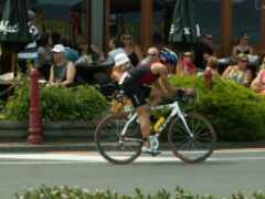 一時間もしないうちに、上位の選手たちの集団が上がってきました。自転車へのトランジットに向かいます。もう、わたくし、この辺で感動しまくってレースにぞっこんです。